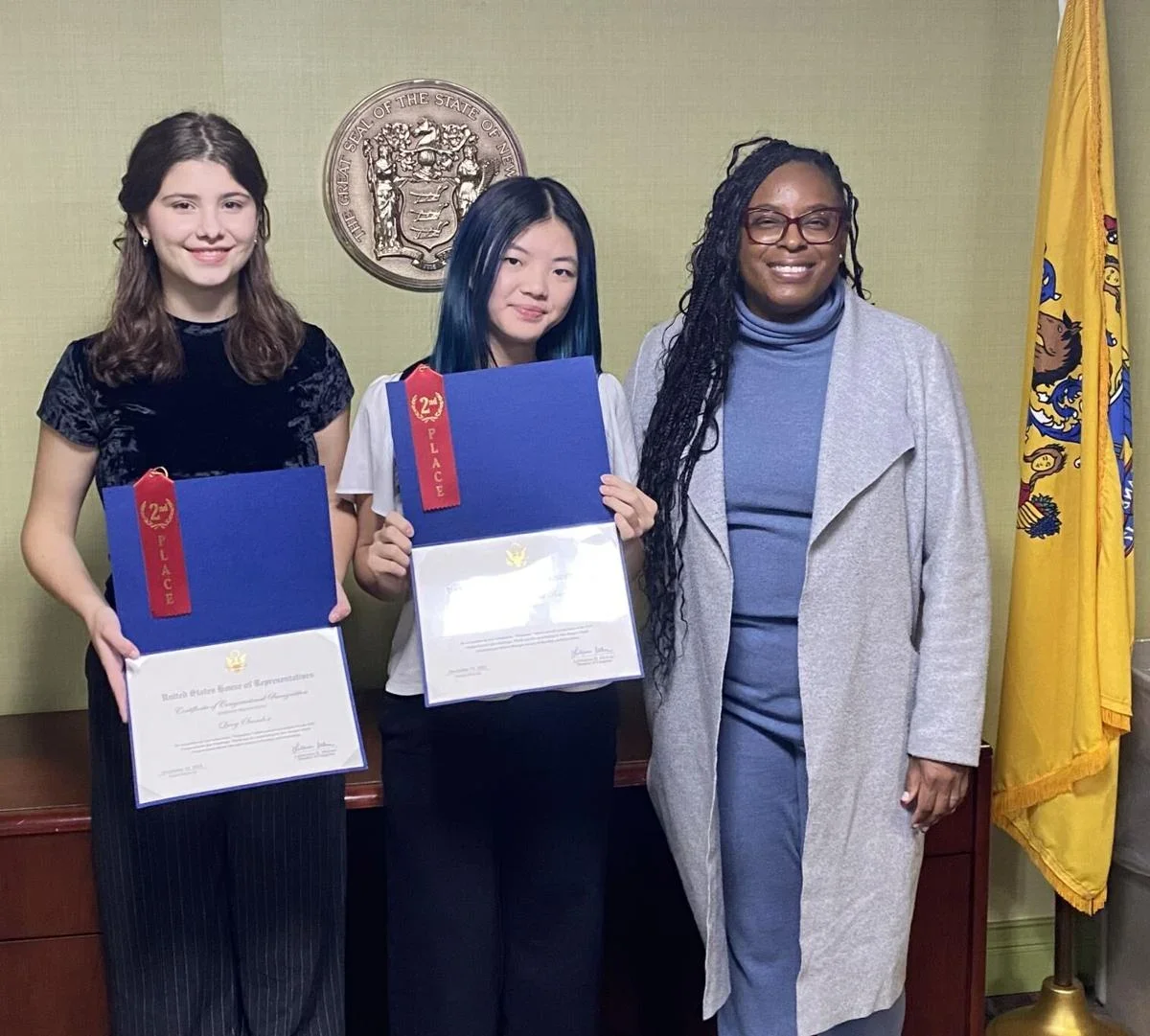Lucy Sandor (left) and Nina Deng (middle) awarded 2nd in Congressional App Challenge by Rep. LaMonica McIver (right).